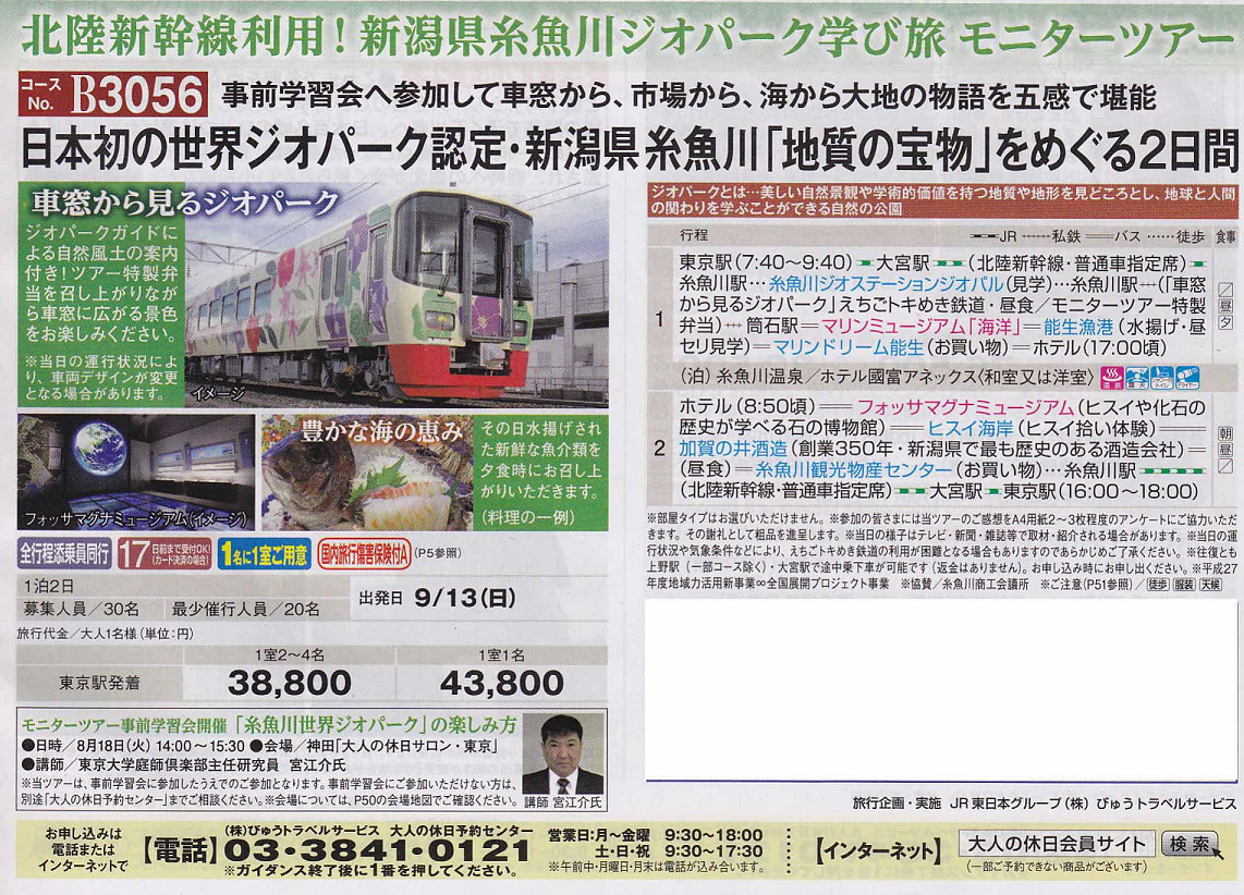 9月13日(日)に、糸魚川ジオパークで学び旅のモニターツアーが開催されます。